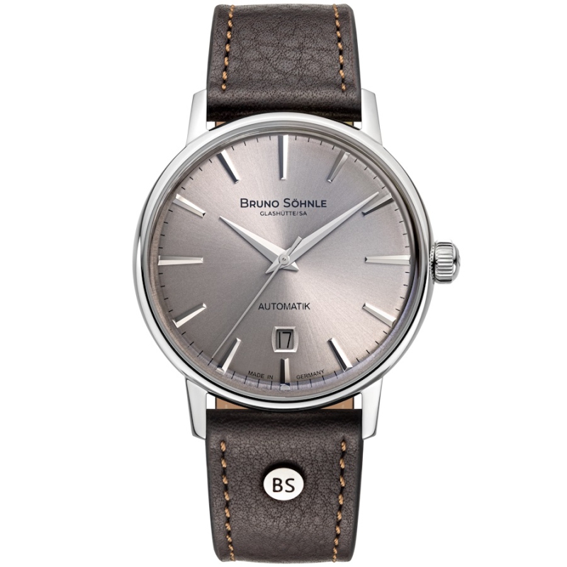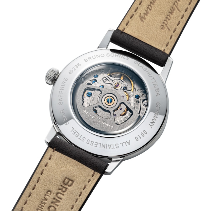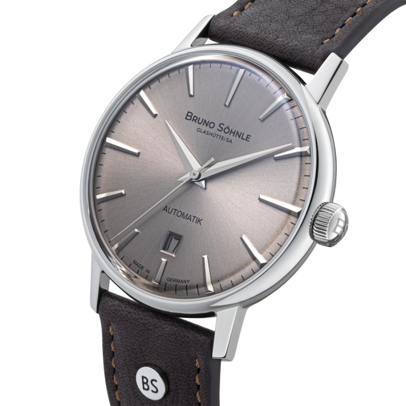 Atelierkaliber BS175 (Basiswerk Sellita SW200-1), Edelstahl, Ø 39 mm, Höhe 10,7 mm, Bandanstoß zu Bandanstoß 45,9 mm, 5 bar, gewölbtes Saphirglas innen entspiegelt, Bio Echtlederband (mokka) mit Ziernaht Ton in Ton, Bandverlauf 20/18 mm, Dornschließe